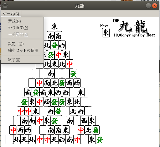 高校時代の後輩が僕が当時書いたプログラムを見つけてくれた。山が崩れないように 字牌 を順番に取っていくというゲーム。 Windows 3.1 時代の16bit アプリなので現代の Windows では動かないが、僕は Linux 使いなのでWineで問題なく動かすことが出来た。