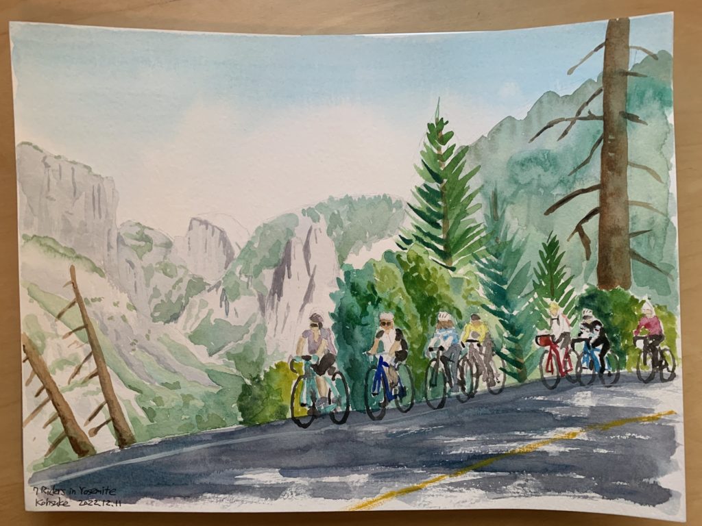秋からは、自転車サークルでの活動を絵に描き、それを自転車仲間に見せるというのを始めた。アメリカ人らしく大袈裟に褒めてくれるので、僕も気を良くする。そのうち、これが、自転車サークルを僕が如何に愛しているかのコミュニケーション手段のように感じられてきた。写真では、現実にあるものしか写せないが、絵なら僕の心象風景をもっとうまく捉えることが出来るんじゃないのか。今はそれを探求している。